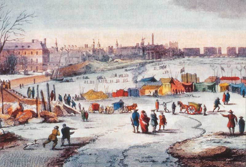 O de Thomas Wyke, que realizó este cuadro en el siglo XVII, representando una feria celebrada en el río Támesis helado, poniendo de moda las «frost fairs»: